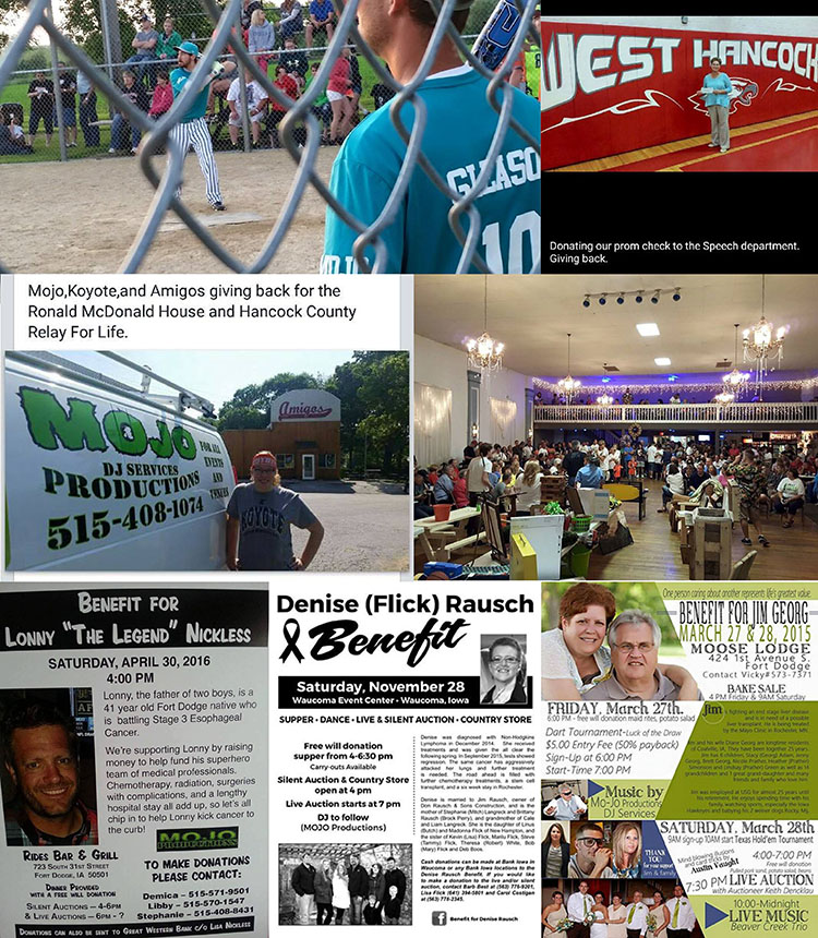 Mojo Productions places a high value on the relationships with the people and communities that keep us in business and feel it is our responsiblity to be generous philanthropists whenever we can. Mojo sponsors various softball, bowling, and racing teams as well as donating our time to provide entertainment for benefit dinners, auctions, and other events. If you have an upcoming benefit, call us, we're happy to help! |